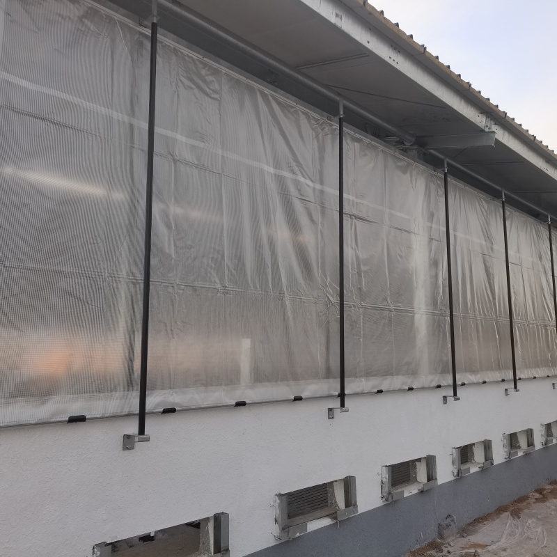 安装时,上部分卷帘固定于上横梁,下部分卷帘固定于下横梁。卷帘系统的上横梁一般位于柱顶向下0.5米处,下横梁位于中间部位,(横梁一般采用100*100*3.5镀锌方管,甲方负责)。该系统采用24V电动升降系统,每段长度不大于30米;为增加抗风系数,除考虑顶端预留0.5米通风孔外,每2米设置内外2根防风镀锌钢管(32*2.5镀锌圆管)。与此同时,卷帘布内置纤维网格,纤维网格密度5*5mm,各部分参数如下: