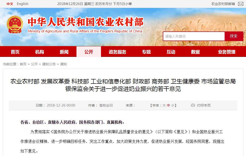 农业农村部等九部委联合印发《关于进一步促进奶业振兴的若干意见》