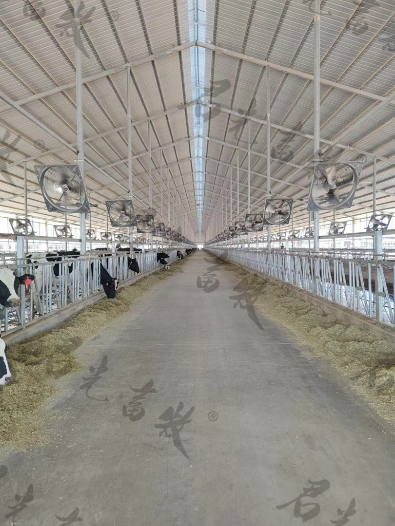 Main components and materials: Upper &lower crossbar:40*50*2.75,Q235。 Straight support rod:Ф42*2.75,Q235。 Bending support rod:Ф42*2.75,Q235 special equipment processed:inner arc has no ripples, and the outer arc has no scratches. Moveable rod:Ф42*2.75,Q235。 Supports for moveable rod:stamping, 4.25mm thick,Q235 After welding completed, all the above main components will be overall galvanized , and the galvanized layer more than 80um. Self locking system: the dovetail clip is stamped by 4mm integral galvanized Q235 steel plate, Transmission pipe of self locking system: Q235 galvanized tube,Ф25*2.5. 6m/piece/8 cow position, every 3m fastened by special clamps with reinforced columns,